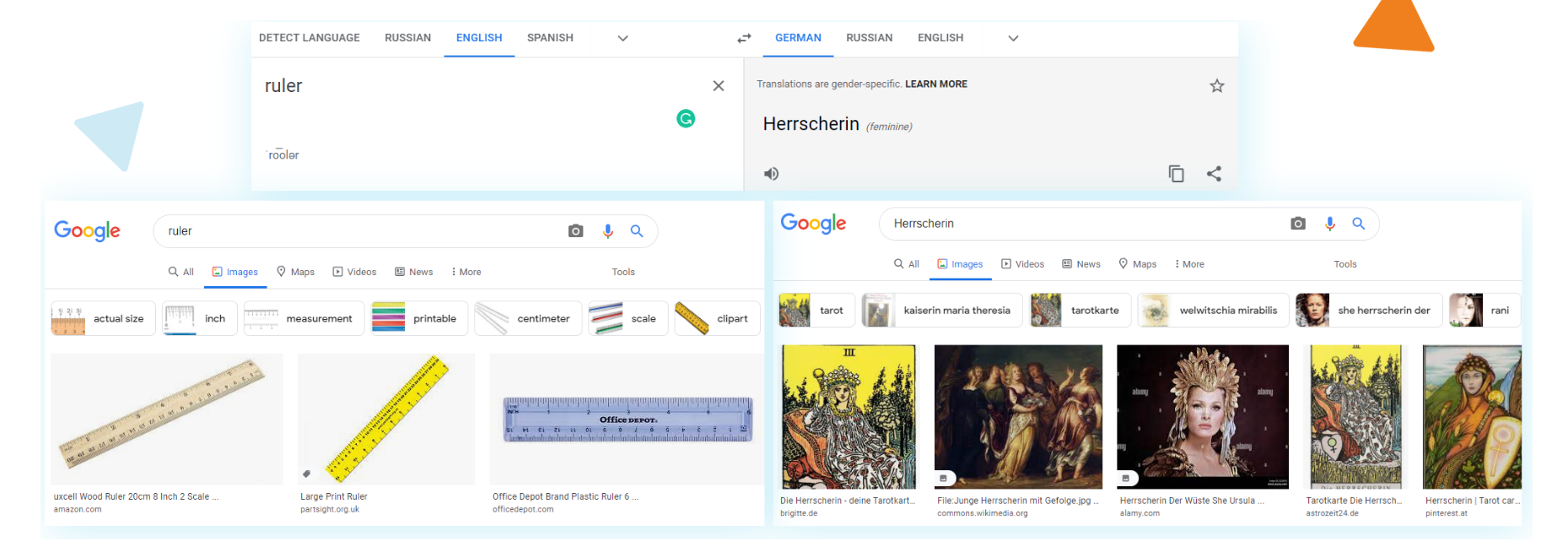 Если вы делаете самостоятельные переводы через Google Translate, то, как себя проверить. Для этого используем Google Картинки. Например, есть запрос «ruler» (линейка) и мы его перевели на немецкий. Мы не знаем правильный это перевод или нет, поэтому Google Картинки нам тут помогут. На английском ruler это линейка, на немецком это явно не линейка, а что-то связанное с правителем. Если перевести слово ruler на русский, то это будет правитель. В Германии видимо также.