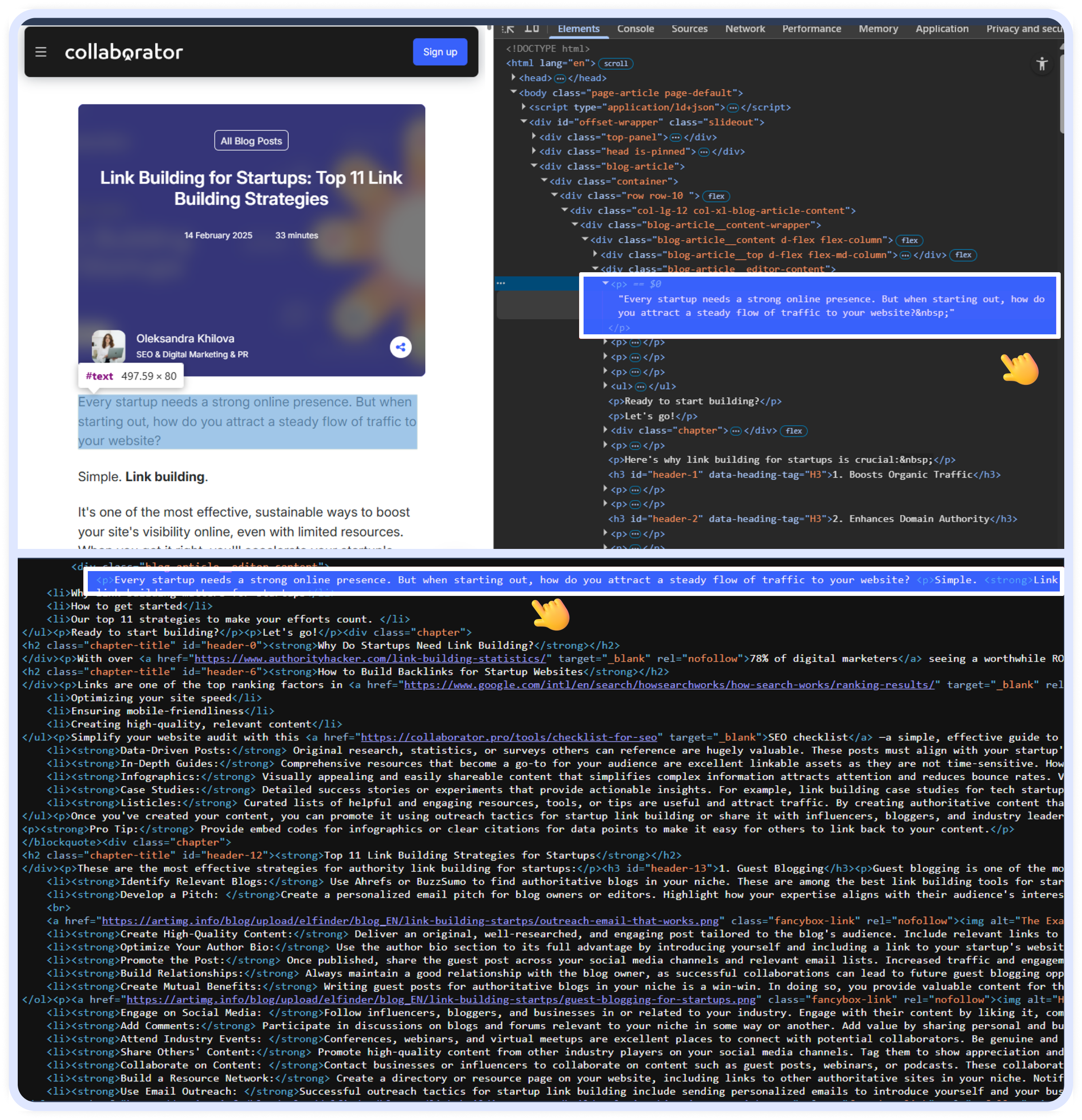Example: check any page on the Collaborator blog, like a lovely article by Oleksandra Khilova https://collaborator.pro/blog/link-building-startups, inspect the elements using inspection tools, and then try to find the same HTML tags as in the page source: https://collaborator.pro/blog/link-building-startups