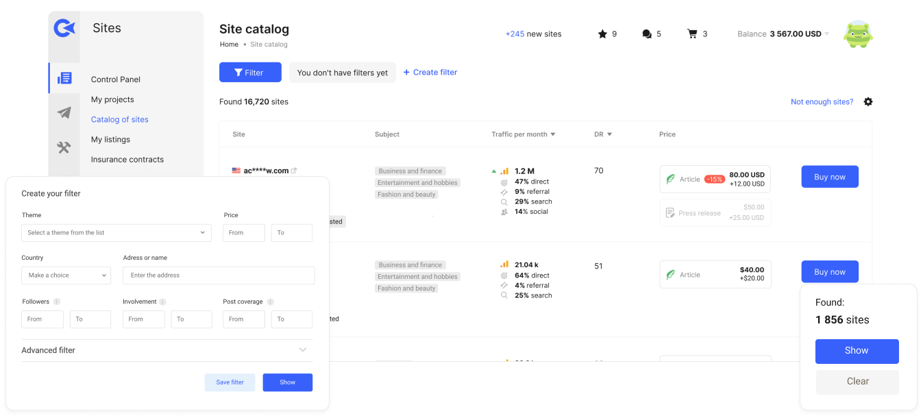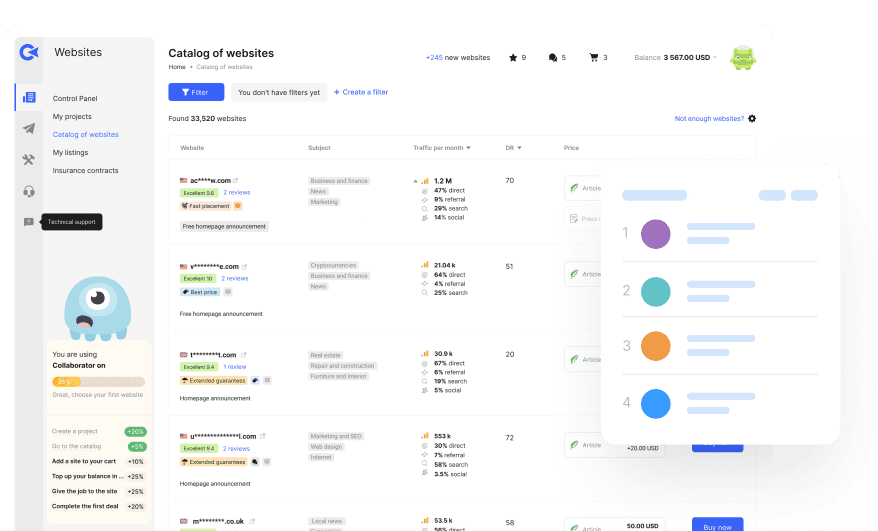 Collaborator’s catalog continues to expand with sites in a range of categories and countries, offering countless link building opportunities. You can easily find the right option for your marketing and SEO needs by using our 40+ filter options.